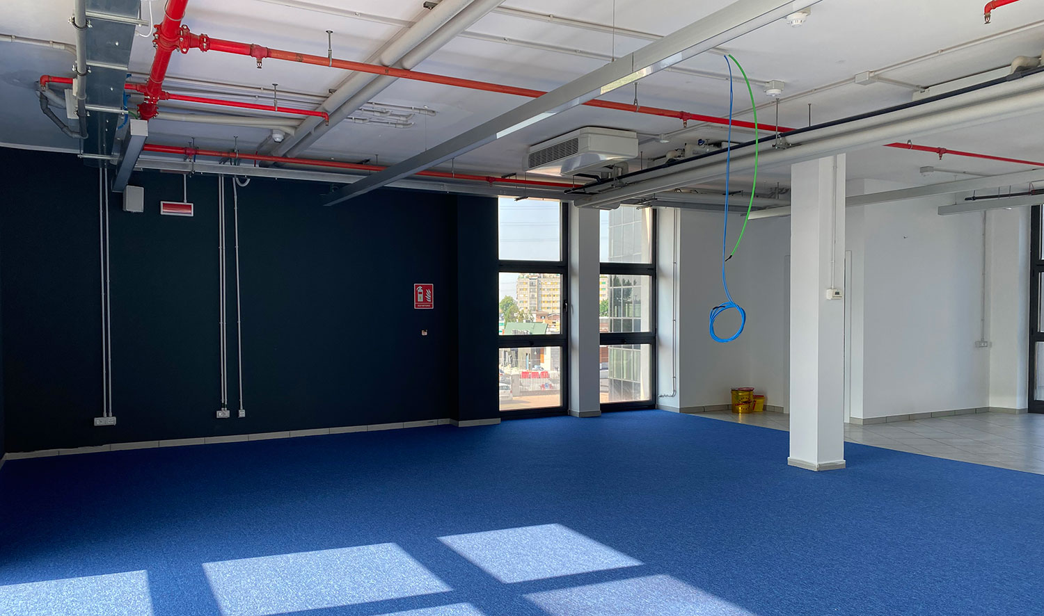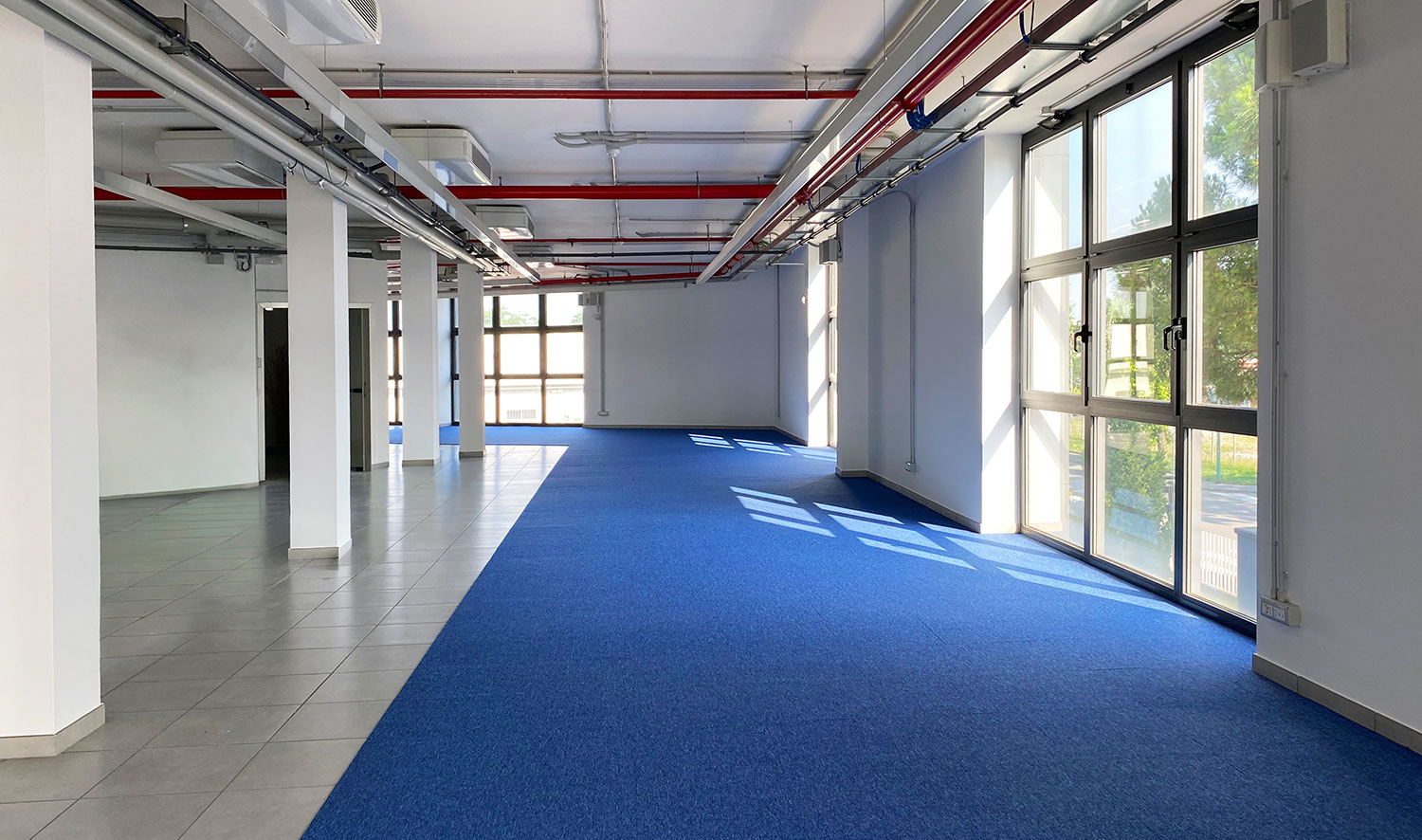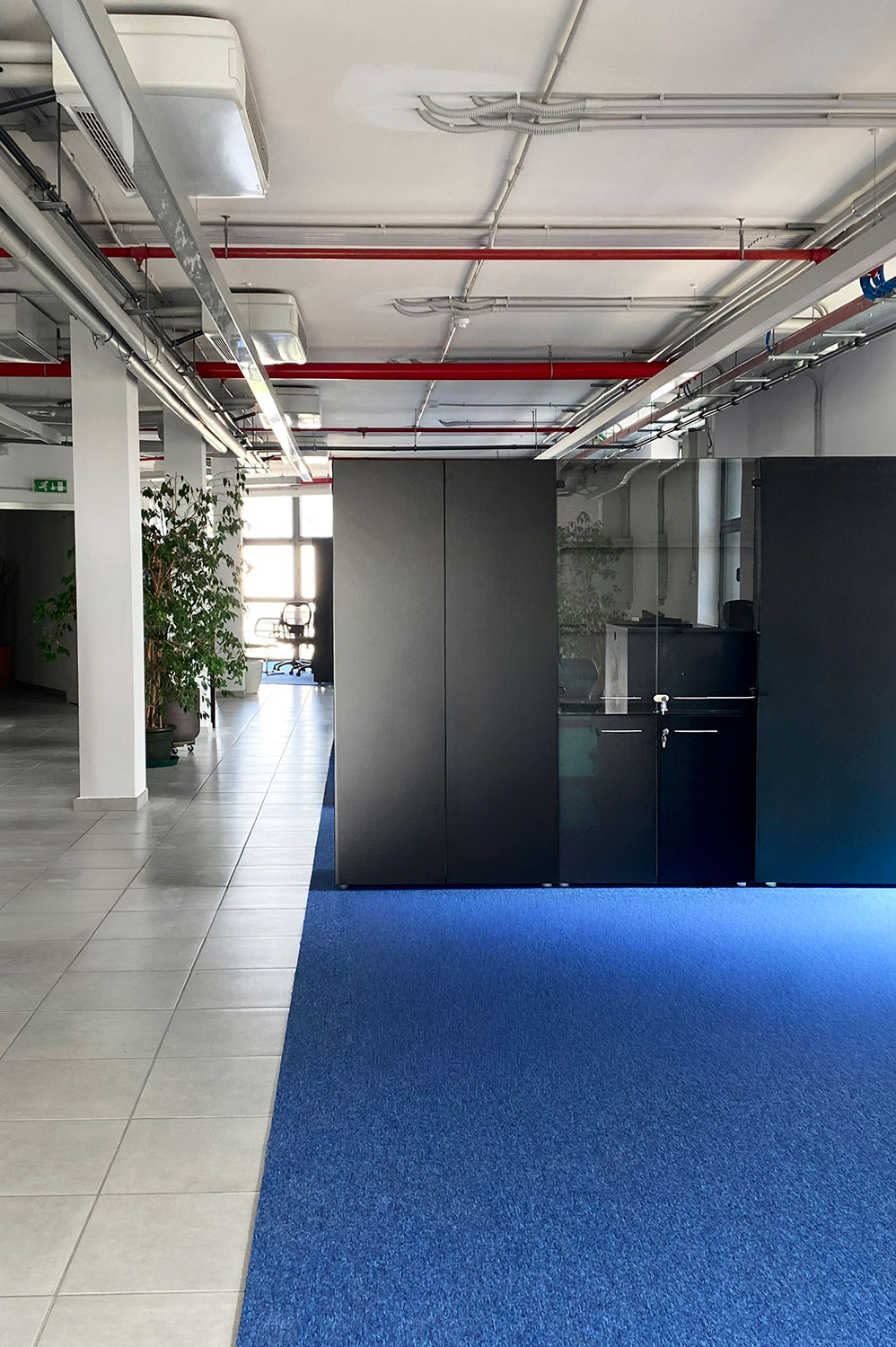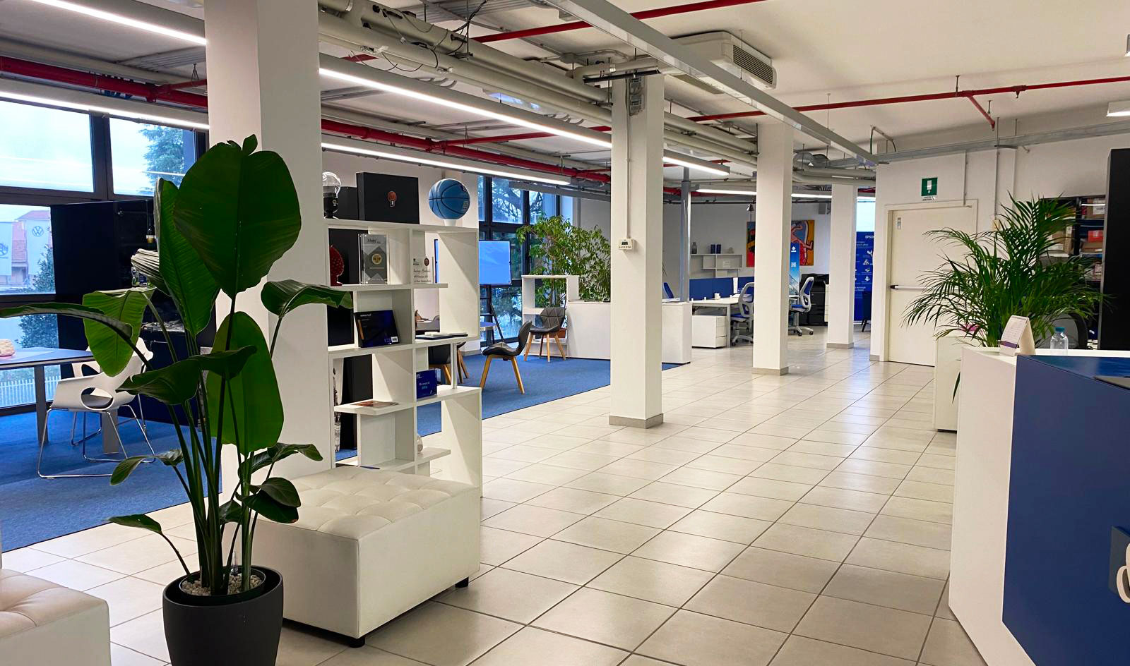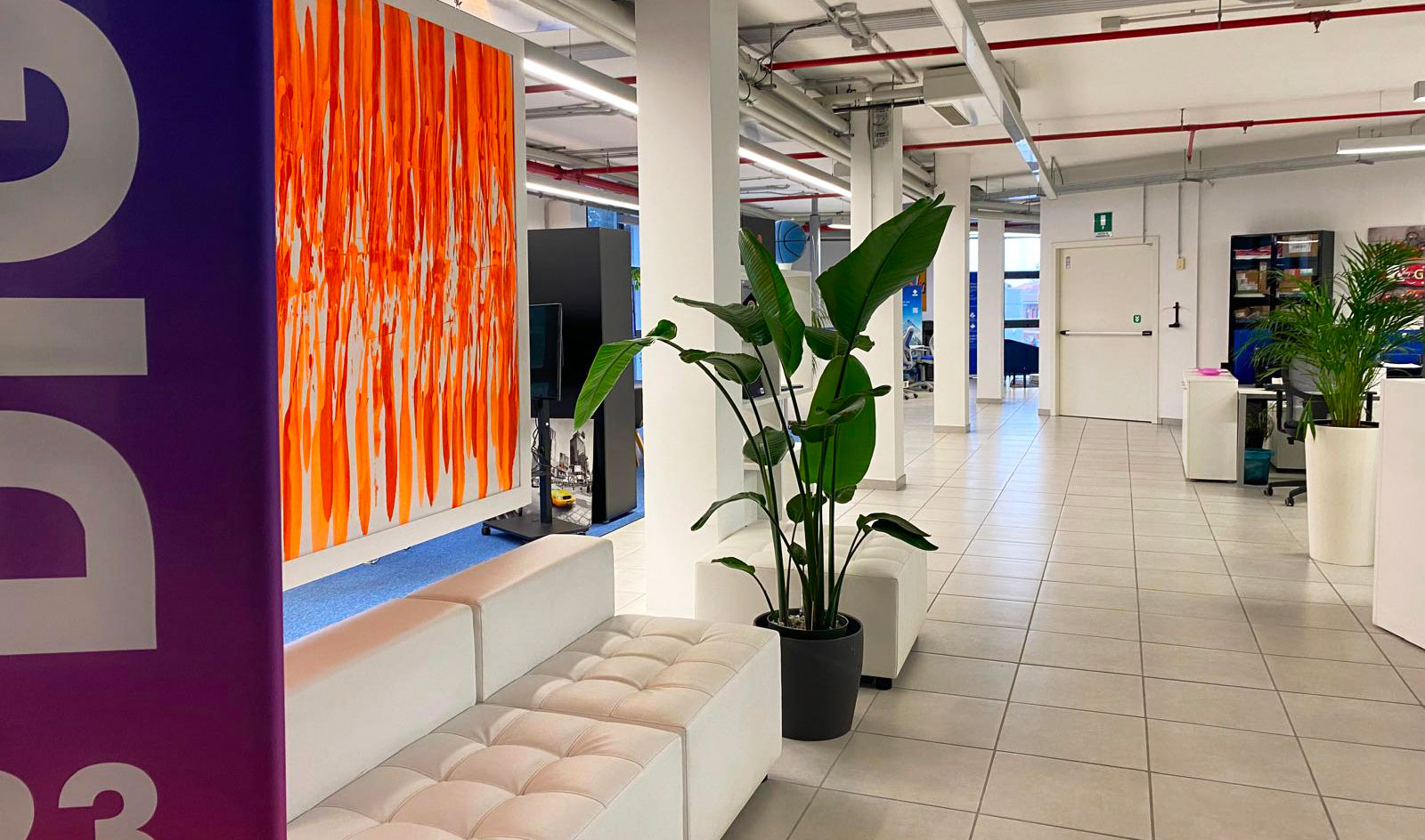 Gli arredi divisori e la moquette acustica nel colore distintivo del brand creano continuità visiva e rafforzano la corporate identity aziendale.