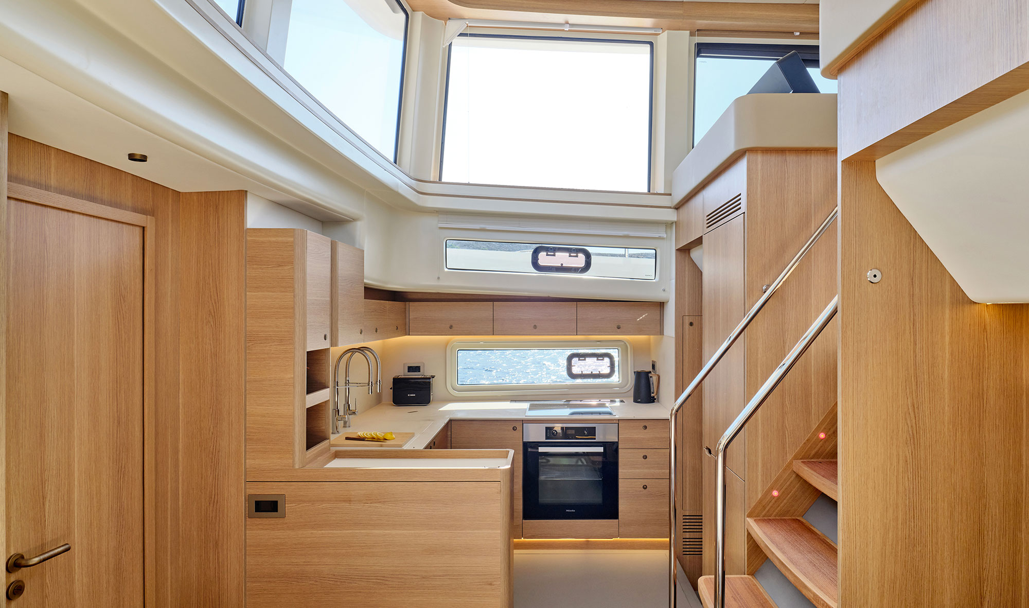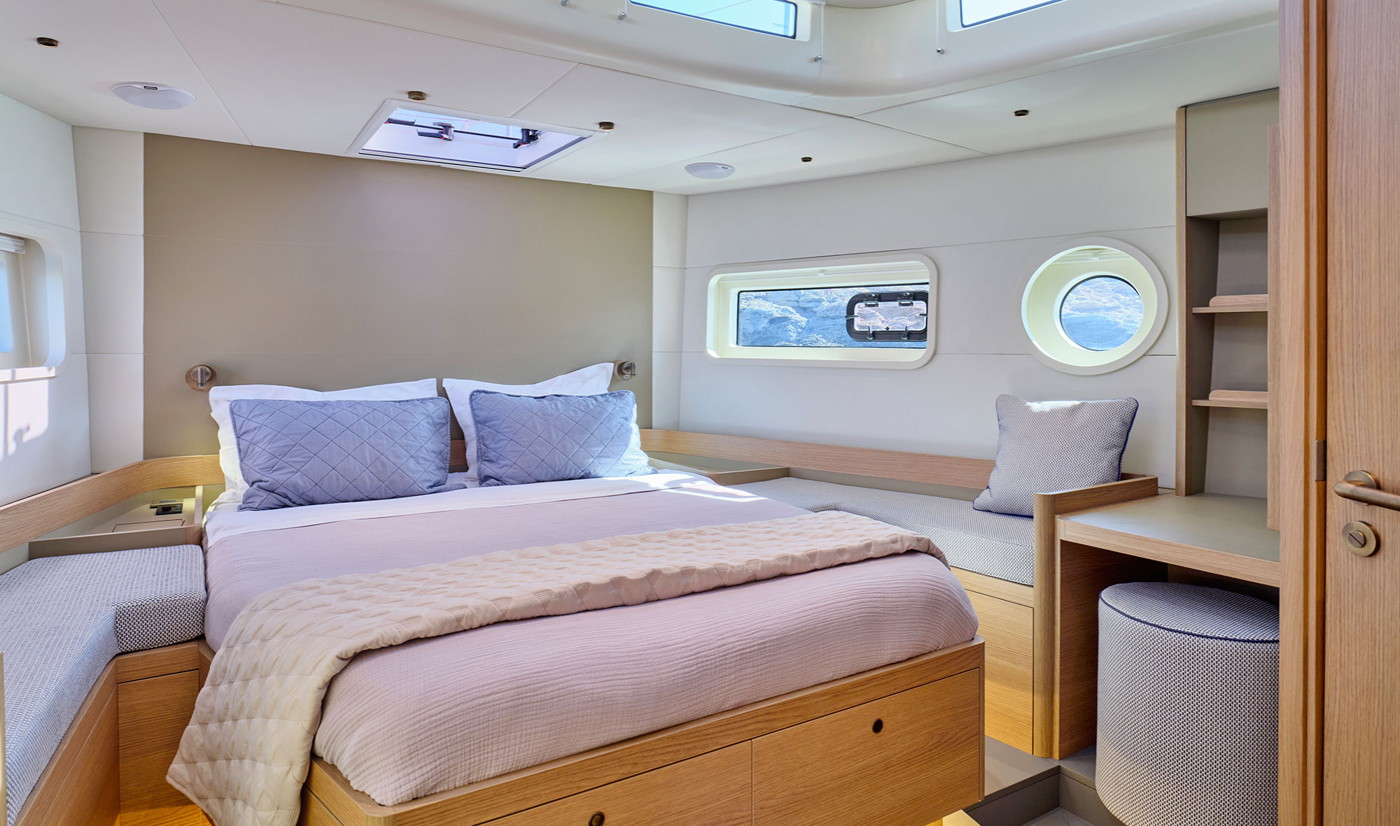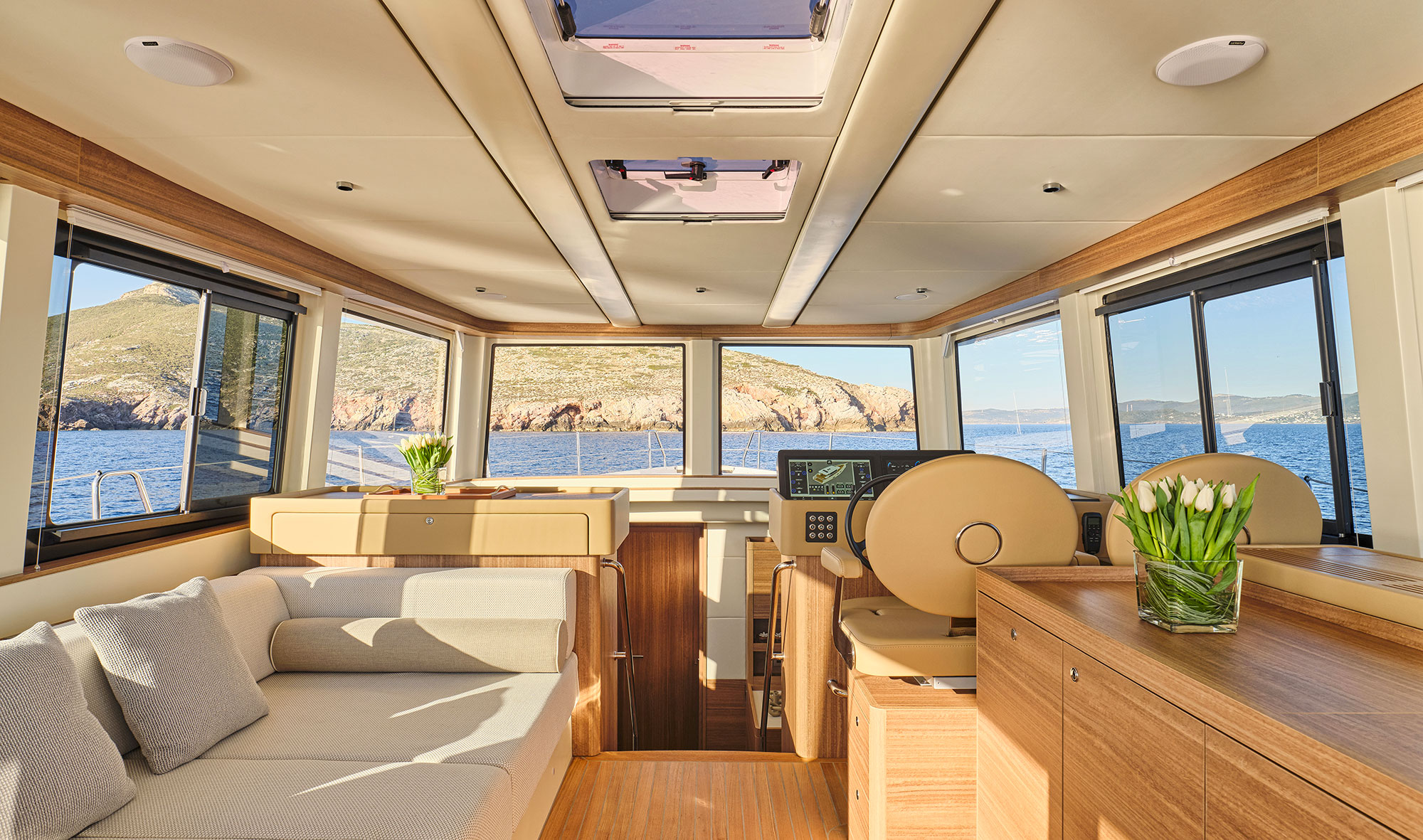 Lo studio delle strutture portanti e il loro assemblaggio ha permesso di valorizzarne la qualità costruttiva rendendole parte integrante dell’arredo interno. Superfici lucide a gelcoat si alternano ad essenze, tessuti e finiture in acciaio lucidato.