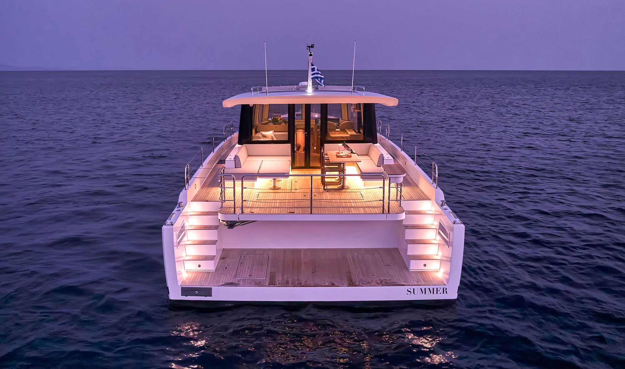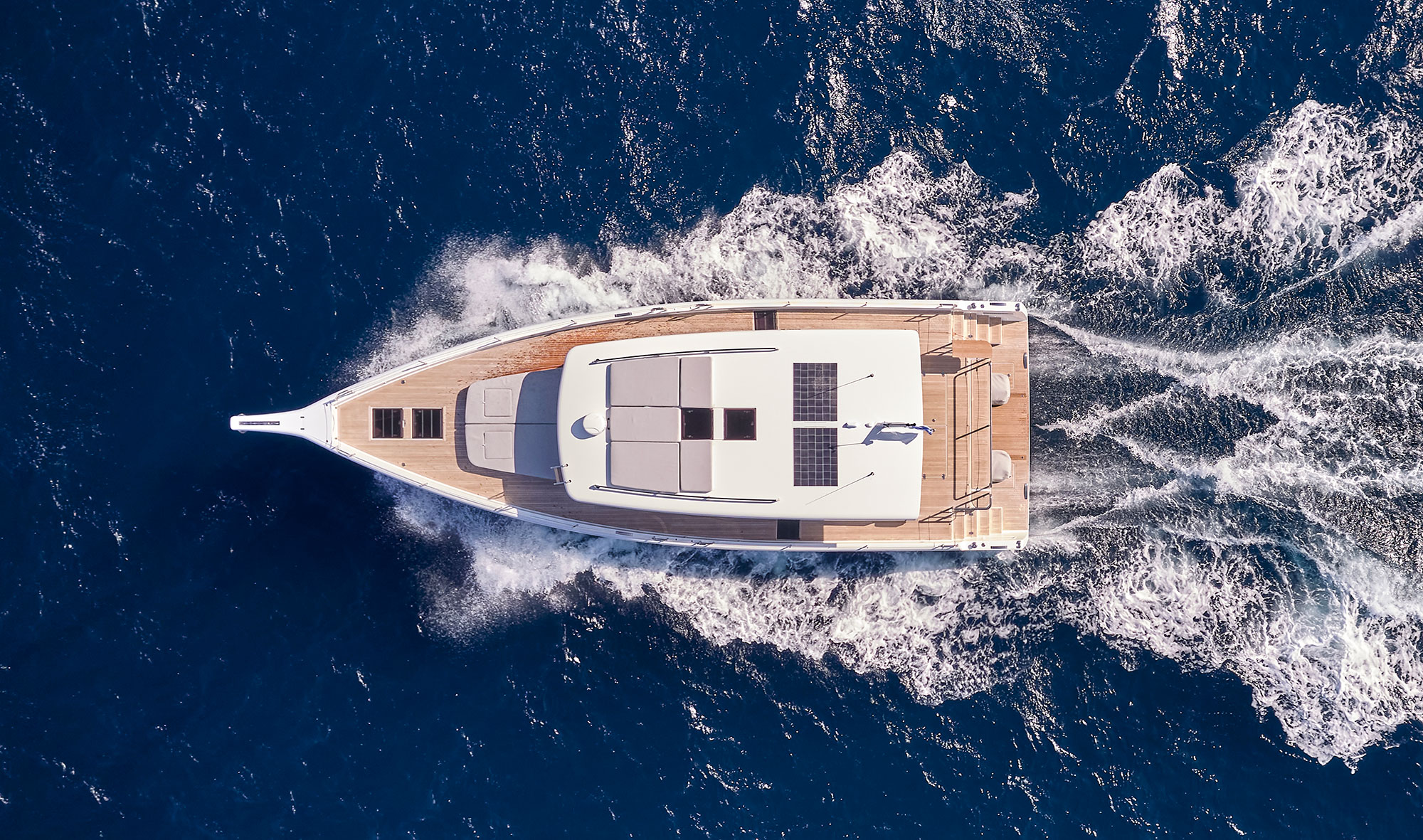 Le forme larghe dello scafo offrono superfici di coperta generose e una grandissima plancia a poppa per stivare il tender e per un accesso al mare diretto e senza barriere.