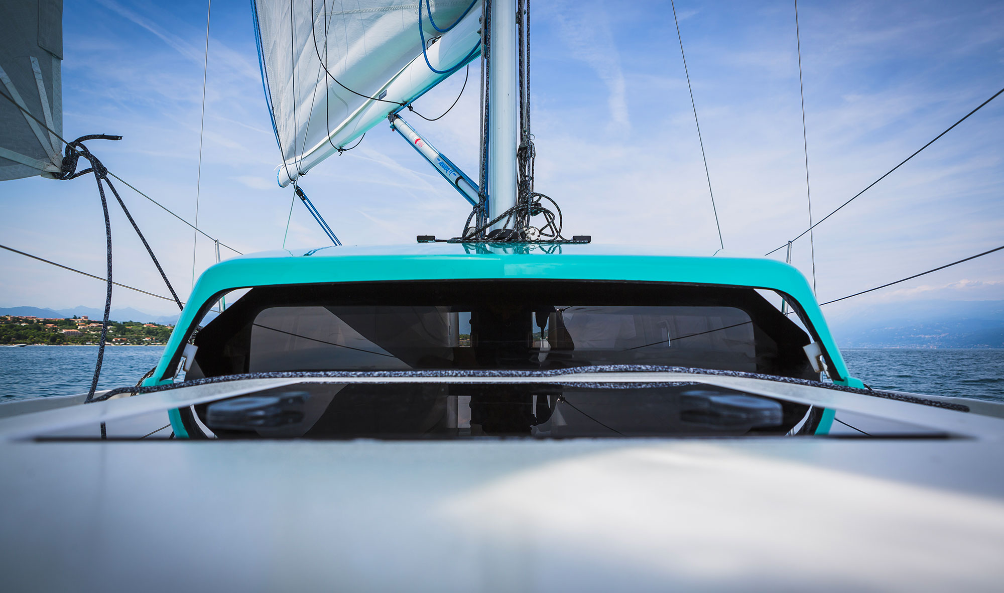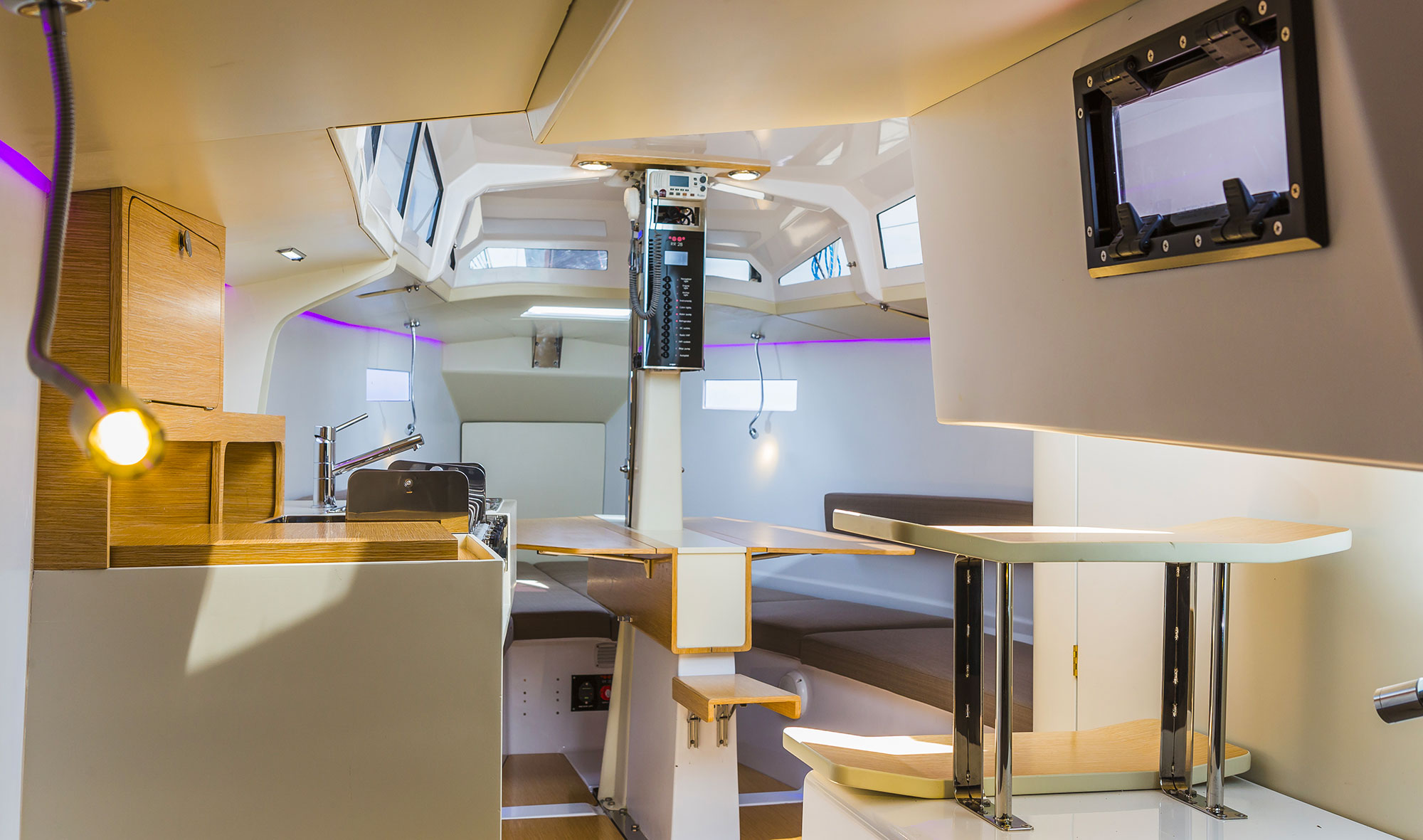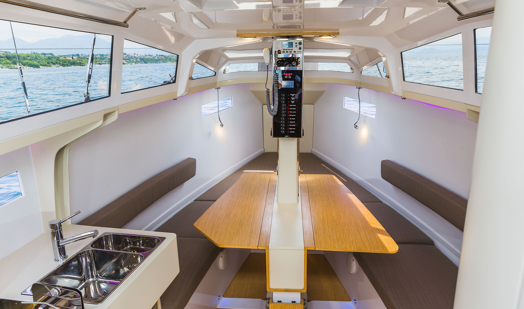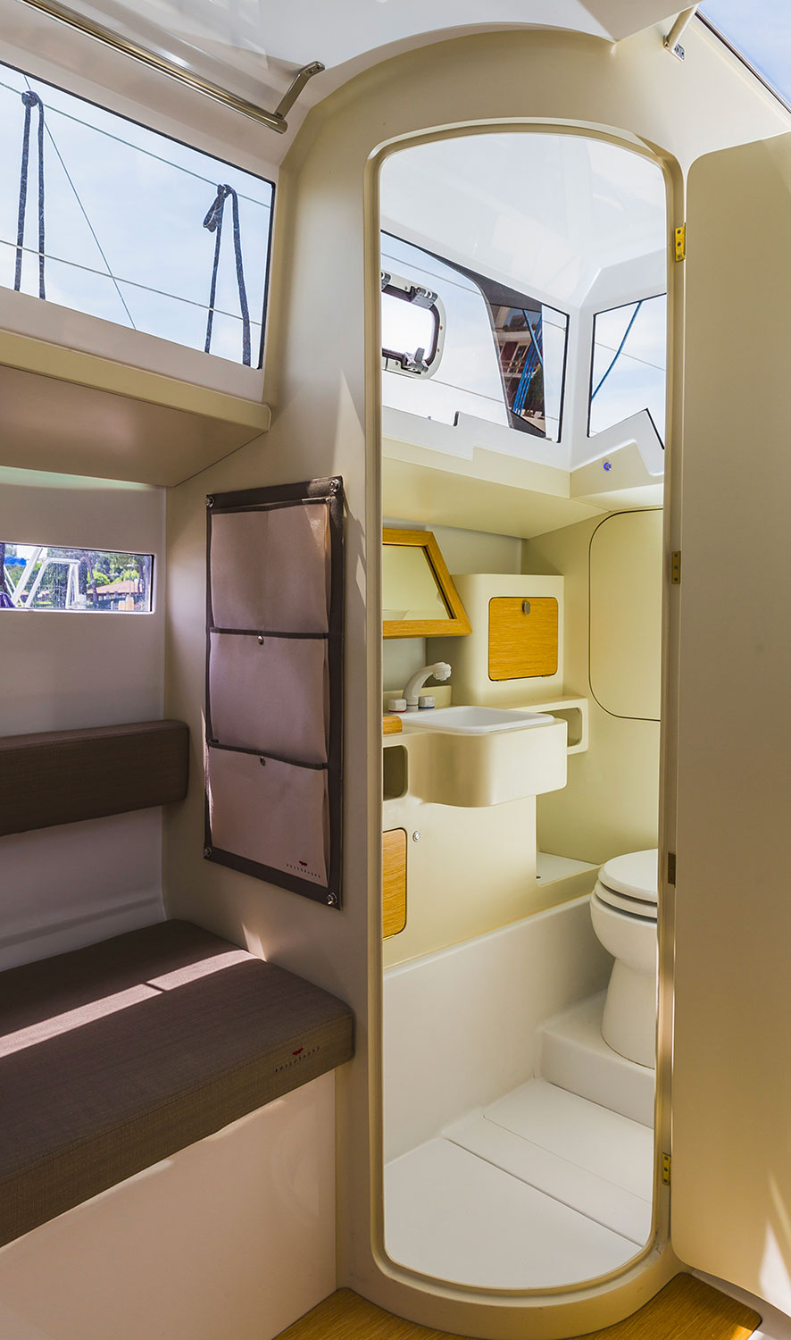 Gli ambienti open space offrono un’abitabilità senza compromessi e la tuga completamente finestrata permette una visuale verso l’esterno a 360°. Il bagno offre una vivibilità completa e un’altezza di 1,95 metri.