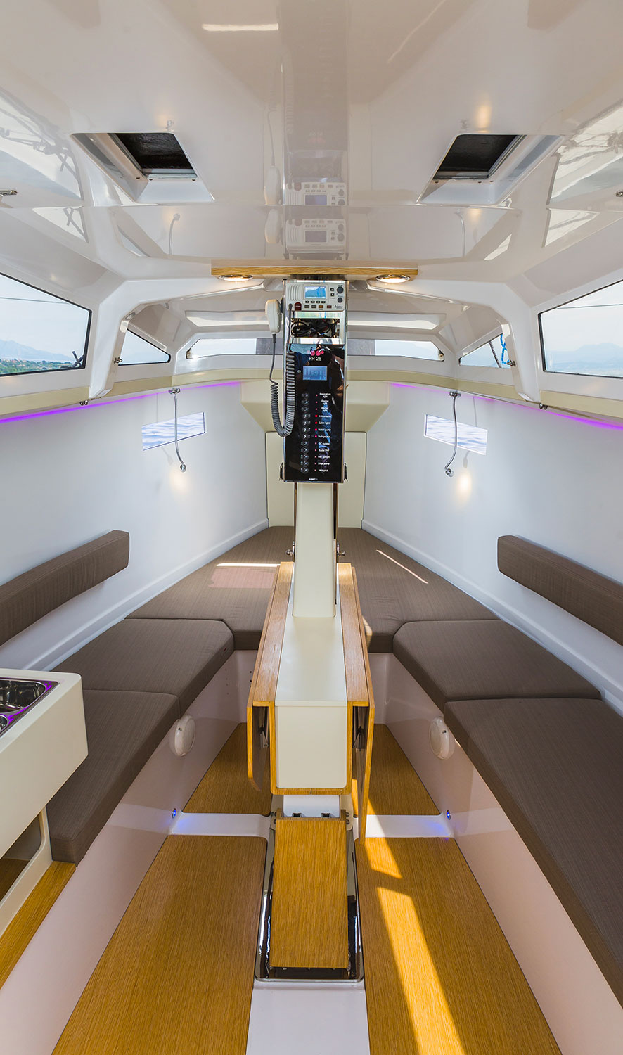 Lo studio ergonomico tanto nella fruibilità interna, quanto nella distribuzione delle manovre, ha spinto la progettazione ad un livello di approfondimento che solitamente è dedicato ad imbarcazioni ben più grandi.